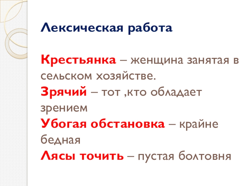 Слайд 17Лексическая работа Крестьянка – женщина занятая в сельском хозяйстве. Зрячий – тот