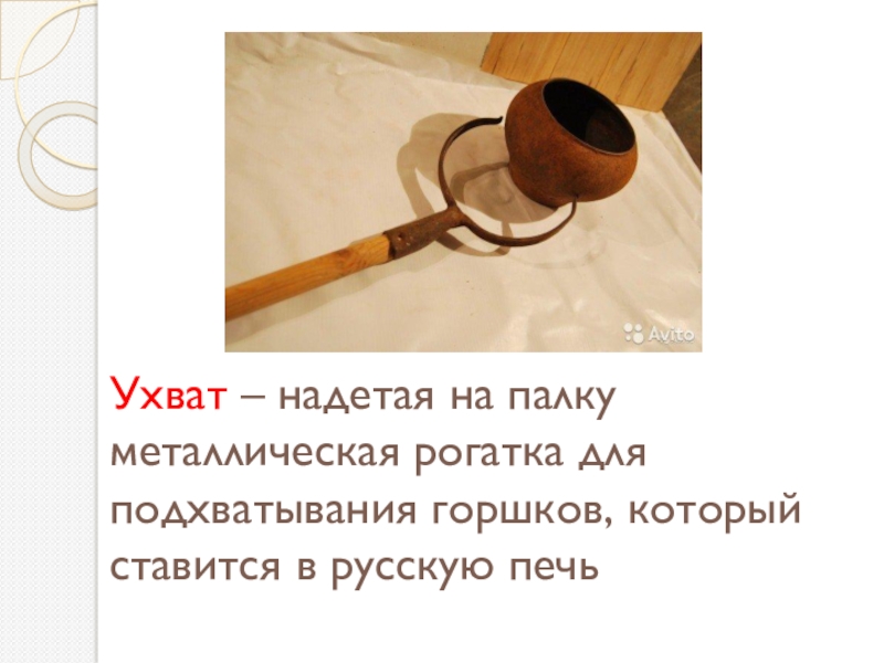 Слайд 18Ухват – надетая на палку металлическая рогатка для подхватывания горшков, который