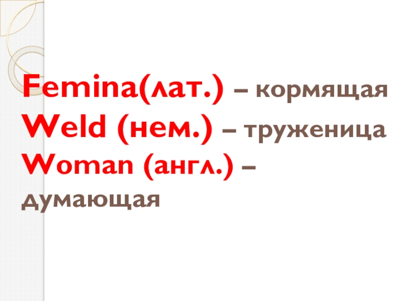 Слайд 3Femina(лат.) – кормящая Weld (нем.) – труженица Woman (англ.) – думающая