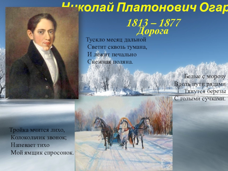 Николай Платонович Огарёв 1813 – 1877 ДорогаТускло месяц дальной Светит сквозь тумана, И лежит печально Снежная поляна.