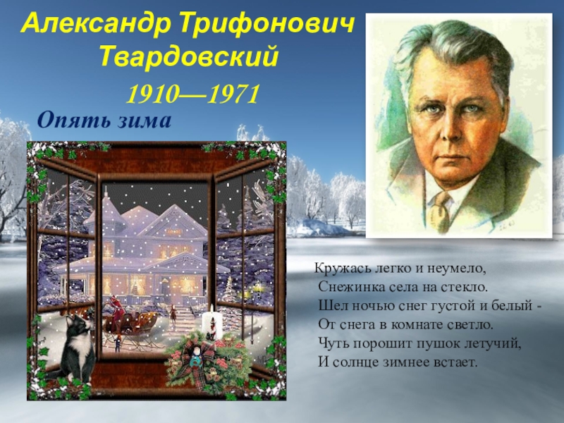 Александр Трифонович Твардовский  1910—1971 Опять зимаКружась легко и неумело, Снежинка села на стекло. Шел ночью снег