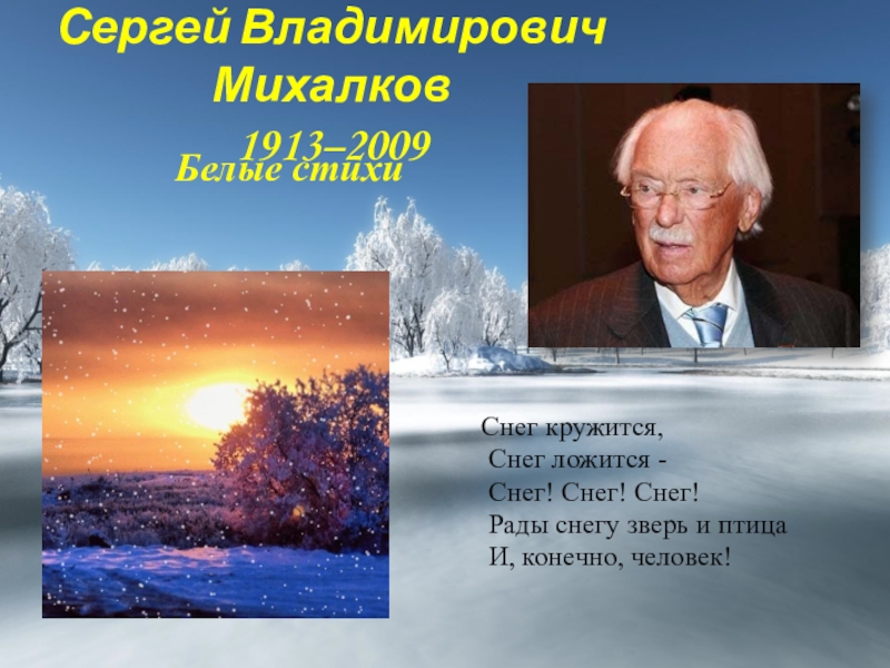 Сергей Владимирович Михалков 1913–2009Белые стихиСнег кружится, Снег ложится - Снег! Снег! Снег! Рады снегу зверь и птица