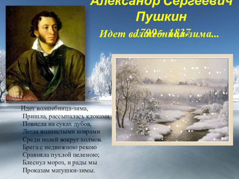 Александр Сергеевич Пушкин 1799 – 1837 Идет волшебница-зима...Идет волшебница-зима, Пришла, рассыпалась клоками Повисла на суках дубов, Легла