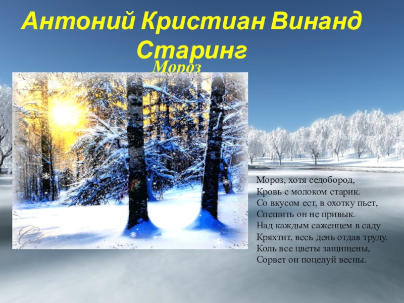 Антоний Кристиан Винанд СтарингМорозМороз, хотя седобород,Кровь с молоком старик.Со вкусом ест, в охотку пьет,Спешить он не привык.Над