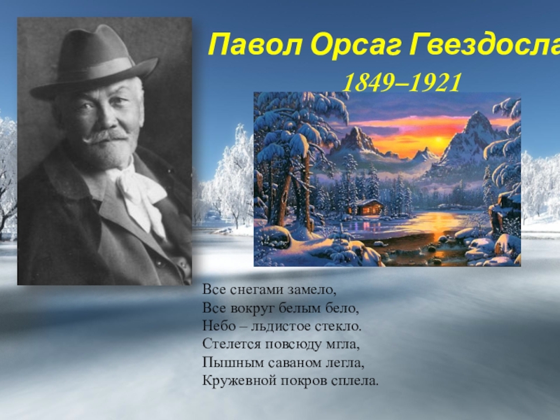 Павол Орсаг Гвездослав  1849–1921Все снегами замело,Все вокруг белым бело,Небо – льдистое стекло.Стелется повсюду мгла,Пышным саваном легла,Кружевной