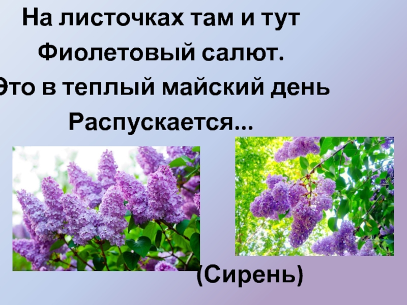 (Сирень)На листочках там и тут Фиолетовый салют. Это в теплый майский день Распускается...