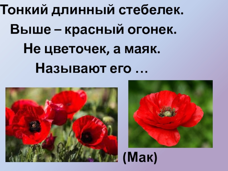 (Мак)Тонкий длинный стебелек. Выше – красный огонек. Не цветочек, а маяк. Называют его …