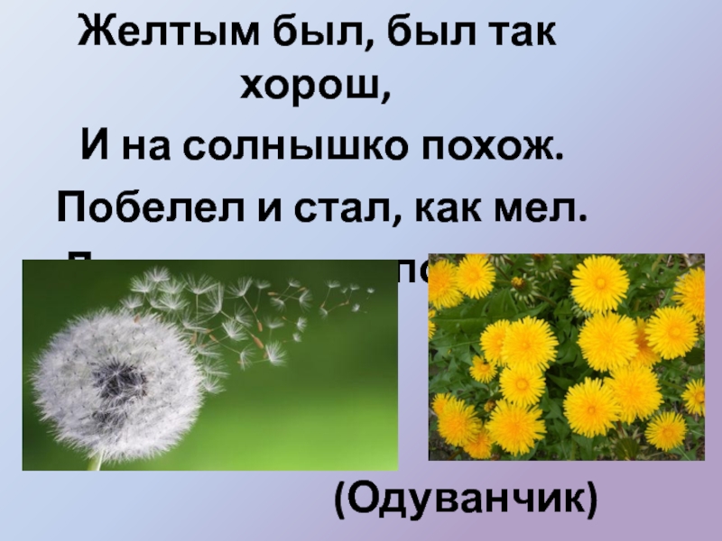 (Одуванчик)  Желтым был, был так  хорош,   И на солнышко похож.  Побелел и стал,