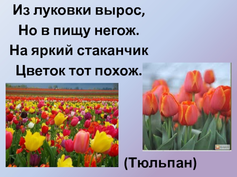 (Тюльпан)Из луковки вырос, Но в пищу негож. На яркий стаканчик Цветок тот похож.