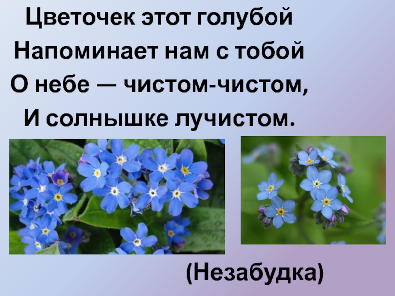 (Незабудка)Цветочек этот голубой Напоминает нам с тобой О небе — чистом-чистом, И солнышке лучистом.