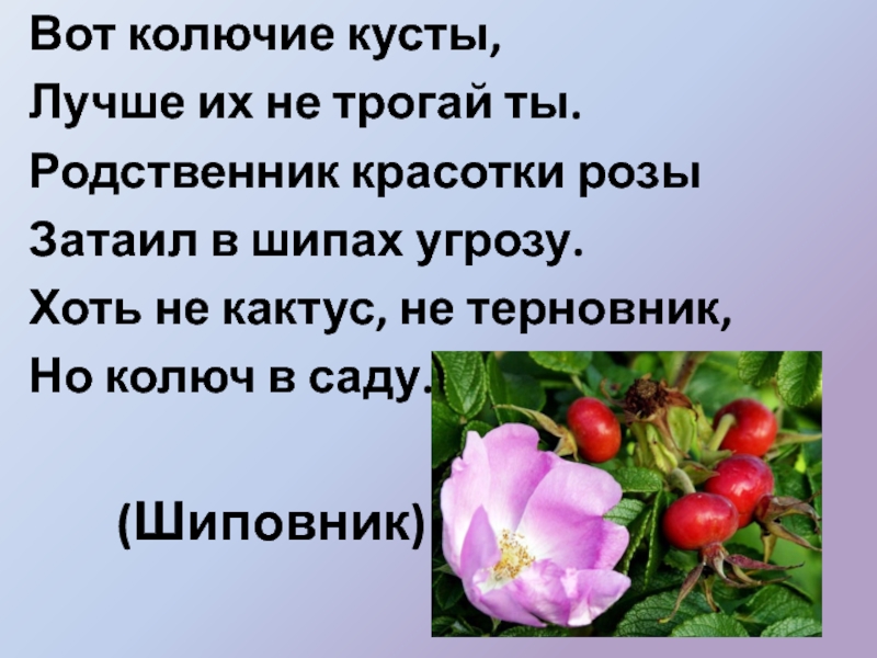(Шиповник)Вот колючие кусты, Лучше их не трогай ты. Родственник красотки розы Затаил в шипах угрозу. Хоть не кактус, не терновник, Но колюч