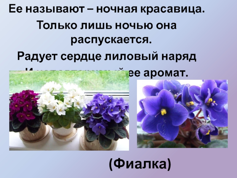 (Фиалка)Ее называют – ночная красавица. Только лишь ночью она распускается.Радует сердце лиловый наряд И неповторимый ее аромат.