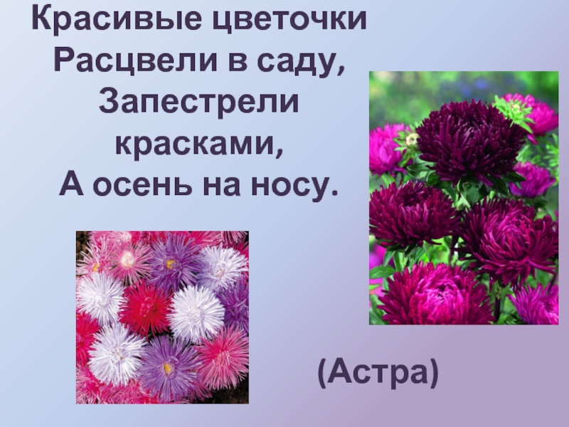 Красивые цветочки Расцвели в саду, Запестрели красками, А осень на носу. (Астра)