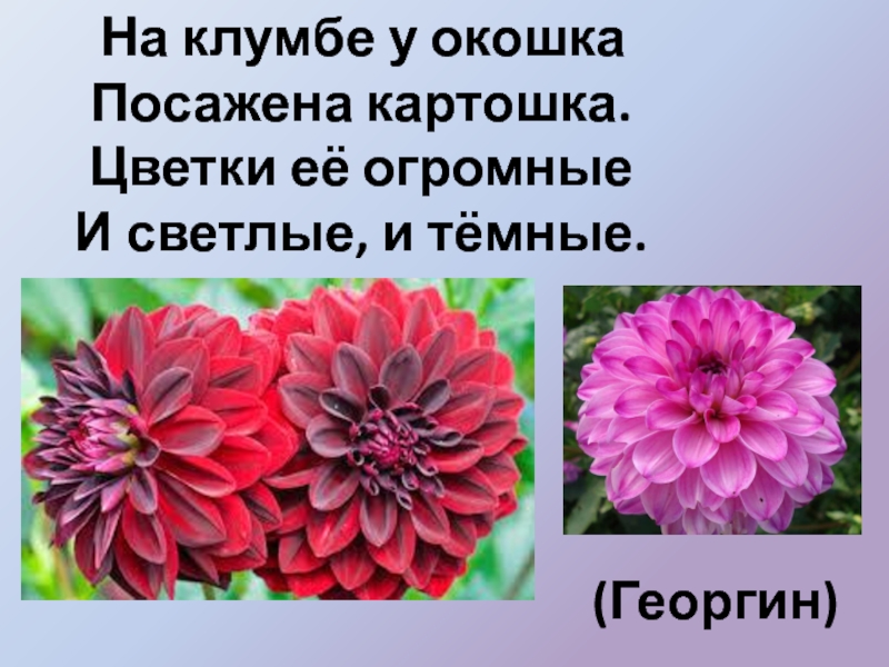 На клумбе у окошка  Посажена картошка.  Цветки её огромные  И светлые, и тёмные.(Георгин)