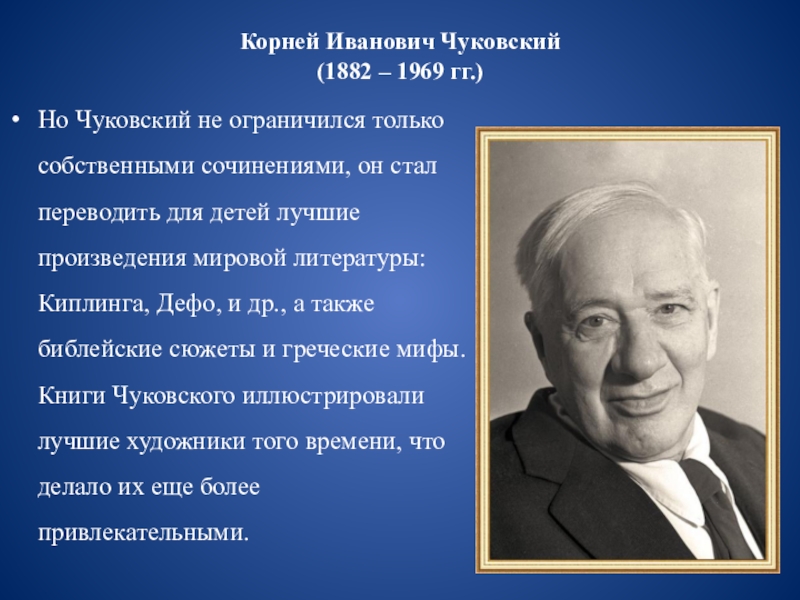 сочинениями, он стал переводить для детей лучшие произведения мировой литературы: Киплинга, Дефо, и др., а также библейские сюжеты и греческие мифы. Книги Чуковского иллюстрировали лучшие художники того времени, что делало их еще более привлекательными.