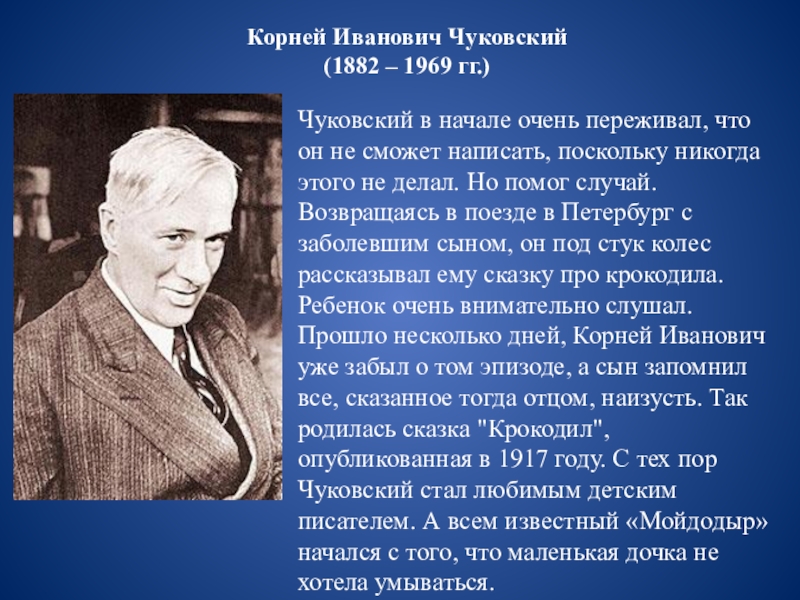 он не сможет написать, поскольку никогда этого не делал. Но помог случай. Возвращаясь в поезде в Петербург с заболевшим сыном, он под стук колес рассказывал ему сказку про крокодила. Ребенок очень внимательно слушал. Прошло несколько дней, Корней Иванович уже забыл о том эпизоде, а сын запомнил все, сказанное тогда отцом, наизусть. Так родилась сказка "Крокодил", опубликованная в 1917 году. С тех пор Чуковский стал любимым детским писателем. А всем известный «Мойдодыр» начался с того, что маленькая дочка не хотела умываться.