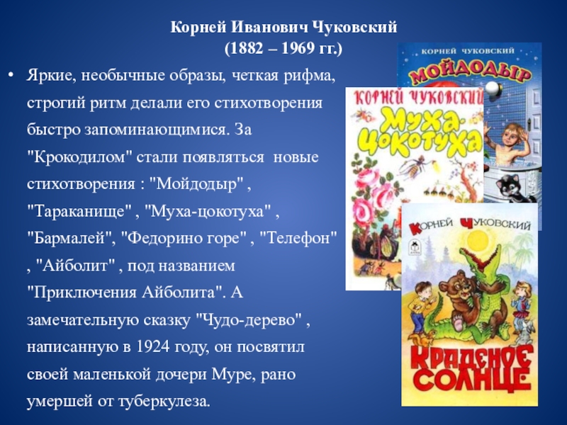 ритм делали его стихотворения быстро запоминающимися. За "Крокодилом" стали появляться новые стихотворения : "Мойдодыр" , "Тараканище" , "Муха-цокотуха" , "Бармалей", "Федорино горе" , "Телефон" , "Айболит" , под названием "Приключения Айболита". А замечательную сказку "Чудо-дерево" , написанную в 1924 году, он посвятил своей маленькой дочери Муре, рано умершей от туберкулеза.