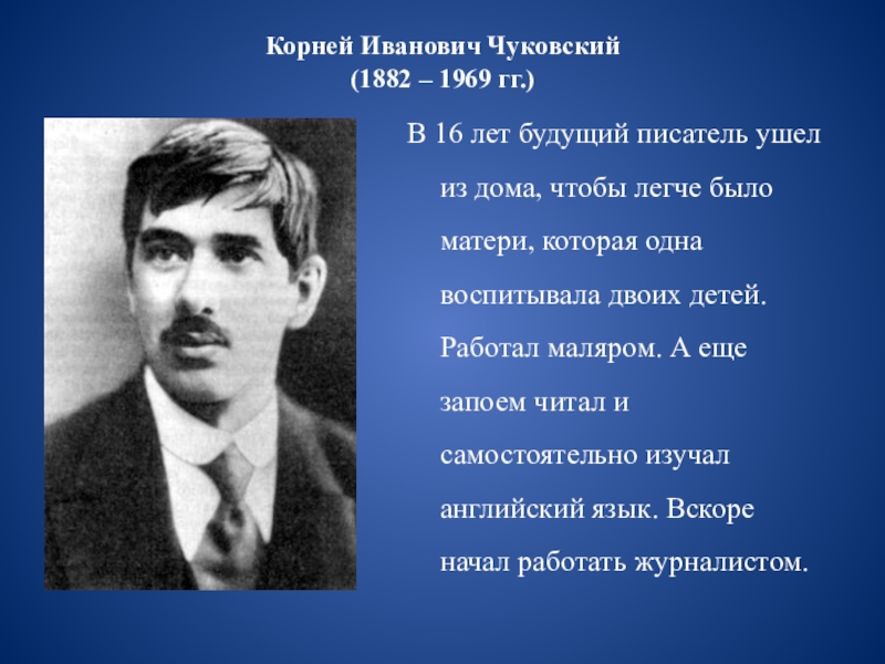 его имя Николай Иванович Корнейчуков. Родился в Петербурге в 1882 году в бедной семье. Свое детство он провел в Одессе и Николаеве. В одесской гимназии познакомился и подружился с Борисом Житковым, в будущем знаменитым детским писателем. Но из гимназии будущего поэта исключили по причине "низкого" происхождения, так как мать Чуковского была прачкой, а отца уже не было. Но юноша не сдался, он занимался самостоятельно и сдал экзамены, получив аттестат.