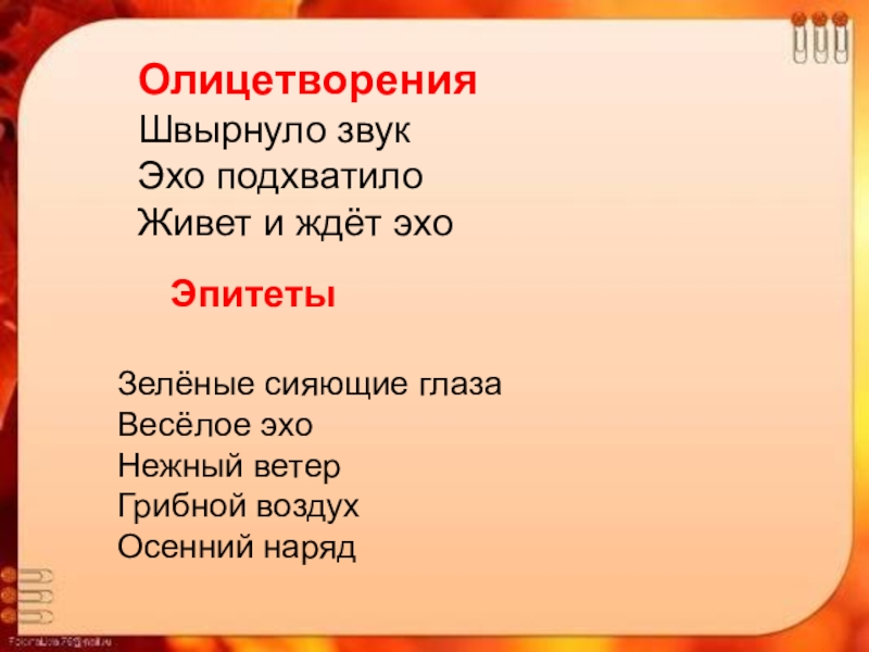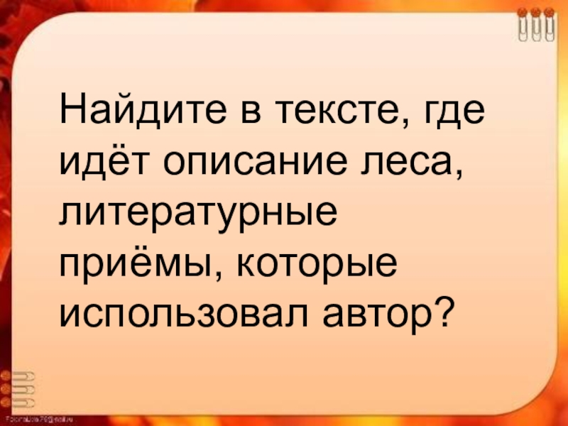 Слайд 32Найдите в тексте, где идёт описание леса, литературные приёмы, которые использовал