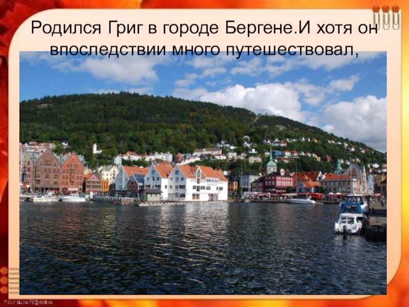 Слайд 16Родился Григ в городе Бергене.И хотя он впоследствии много путешествовал,