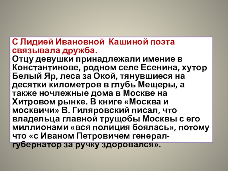 в Константинове, родном селе Есенина, хутор Белый Яр, леса за Окой, тянувшиеся на десятки километров в глубь Мещеры, а также ночлежные дома в Москве на Хитровом рынке. В книге «Москва и москвичи» В. Гиляровский писал, что владельца главной трущобы Москвы с его миллионами «вся полиция боялась», потому что «с Иваном Петровичем генерал-губернатор за ручку здоровался».