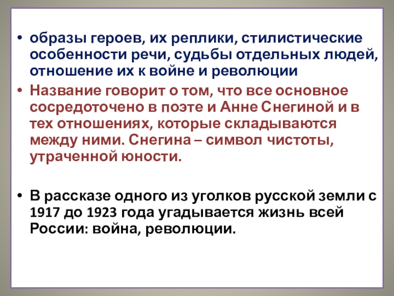 Через отношение к ней раскрывается образ автора. У героини поэтическая, возвышенная натура, что делает ее образ привлекательным. Отъезд из России – трагедия Анны Снегиной.