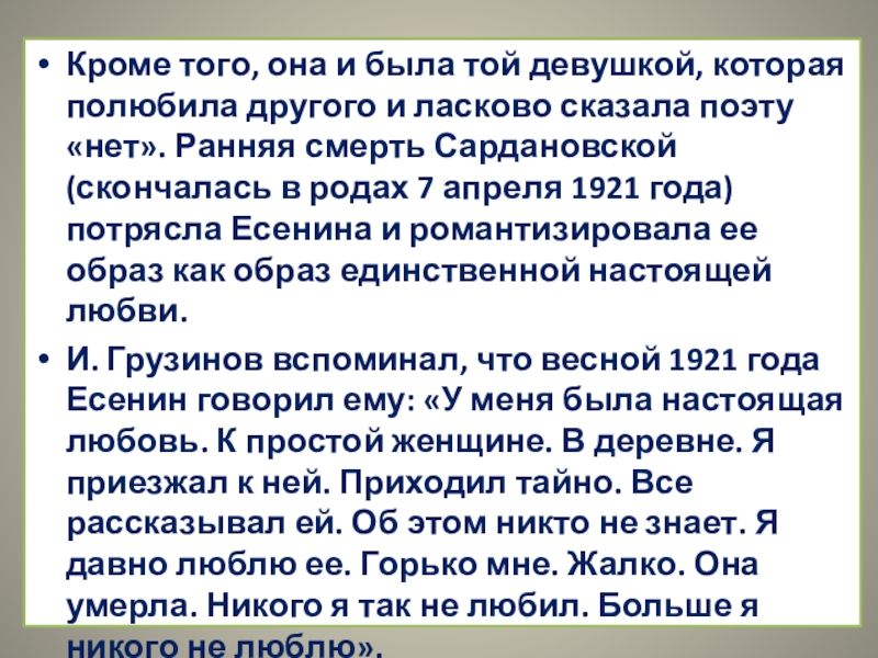 ласково сказала поэту «нет». Ранняя смерть Сардановской (скончалась в родах 7 апреля 1921 года) потрясла Есенина и романтизировала ее образ как образ единственной настоящей любви.