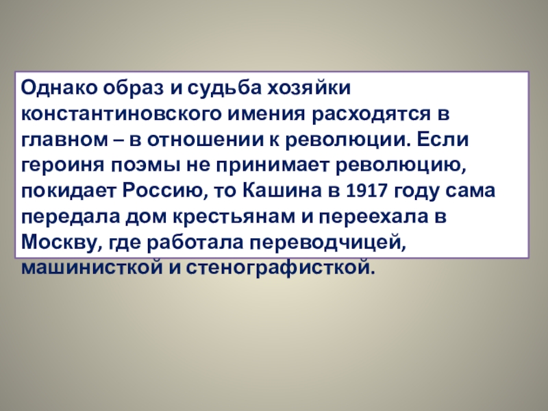 в отношении к революции. Если героиня поэмы не принимает революцию, покидает Россию, то Кашина в 1917 году сама передала дом крестьянам и переехала в Москву, где работала переводчицей, машинисткой и стенографисткой.