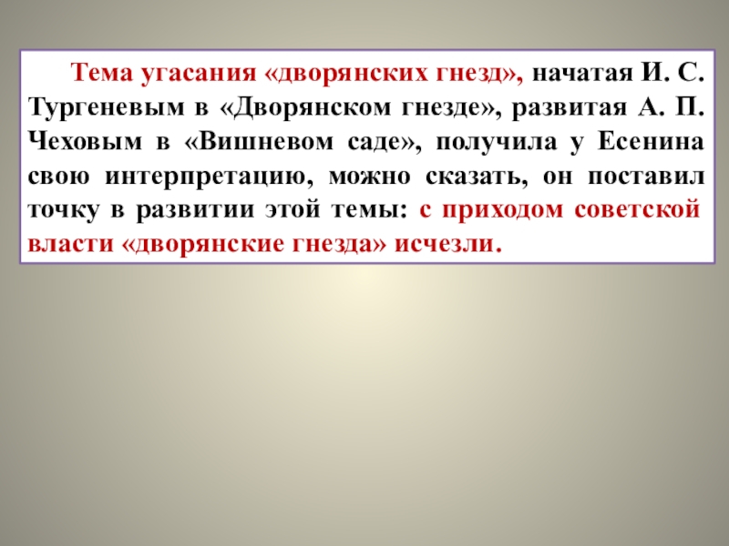 развитая А. П. Чеховым в «Вишневом саде», получила у Есенина свою интерпретацию, можно сказать, он поставил точку в развитии этой темы: с приходом советской власти «дворянские гнезда» исчезли.