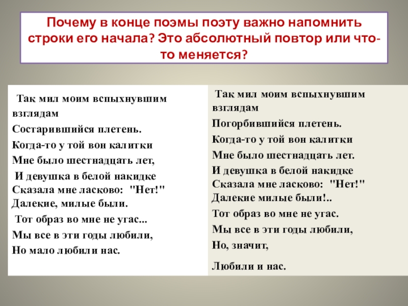 Слайд 24Почему в конце поэмы поэту важно напомнить строки его начала? Это