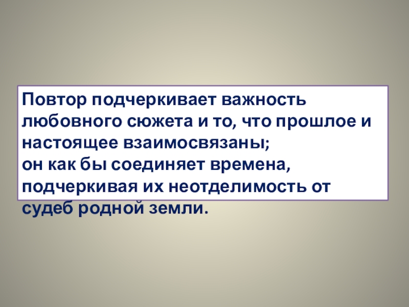 Слайд 25Повтор подчеркивает важность любовного сюжета и то, что прошлое и настоящее