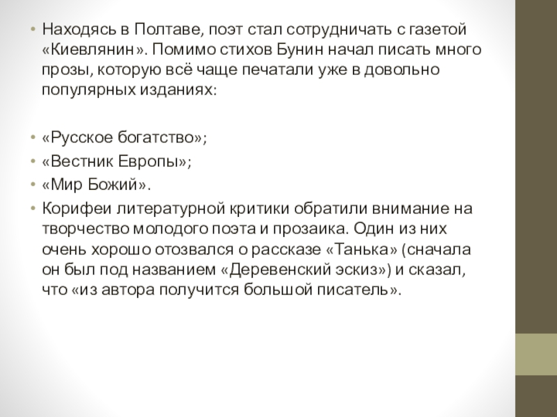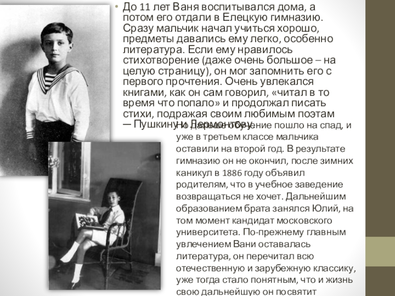 Но дальше обучение пошло на спад, и уже в третьем классе мальчика оставили на второй год. В результате гимназию он не окончил, после зимних каникул в 1886 году объявил родителям, что в учебное заведение возвращаться не хочет. Дальнейшим образованием брата занялся Юлий, на том момент кандидат московского университета. По-прежнему главным увлечением Вани оставалась литература, он перечитал всю отечественную и зарубежную классику, уже тогда стало понятным, что и жизнь свою дальнейшую он посвятит творчеству.