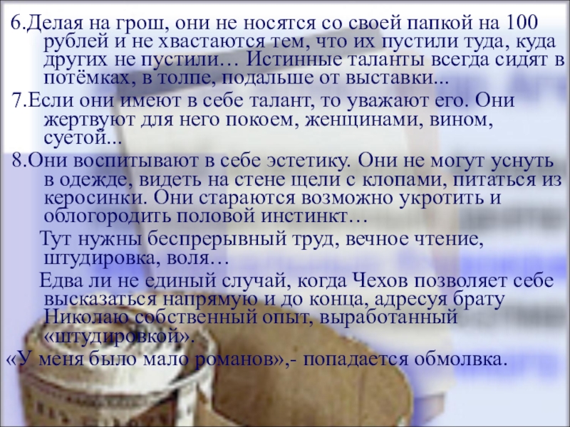 7.Если они имеют в себе талант, то уважают его. Они жертвуют для него покоем, женщинами, вином, суетой...