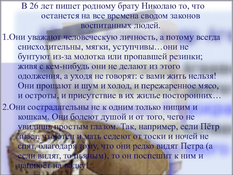 Слайд 4В 26 лет пишет родному брату Николаю то, что останется на