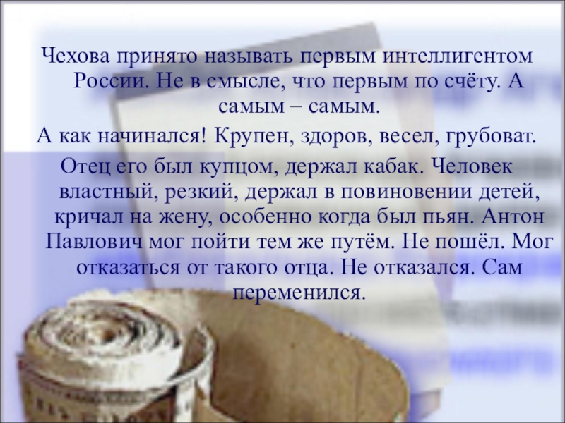 Отец его был купцом, держал кабак. Человек властный, резкий, держал в повиновении детей, кричал на жену, особенно когда был пьян. Антон Павлович мог пойти тем же путём. Не пошёл. Мог отказаться от такого отца. Не отказался. Сам переменился.