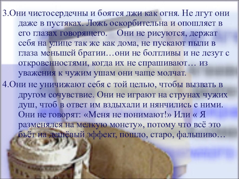 4.Они не уничижают себя с той целью, чтобы вызвать в другом сочувствие. Они не играют на струнах чужих душ, чтоб в ответ им вздыхали и нянчились с ними. Они не говорят: «Меня не понимают!» Или « Я разменялся на мелкую монету», потому что всё это бьёт на дешёвый эффект, пошло, старо, фальшиво…