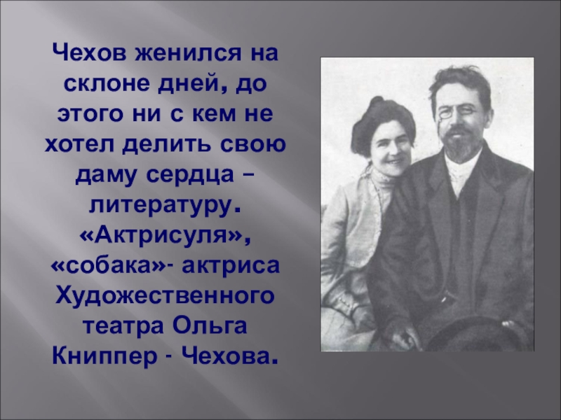 хотел делить свою даму сердца – литературу. «Актрисуля», «собака»- актриса Художественного театра Ольга Книппер - Чехова.