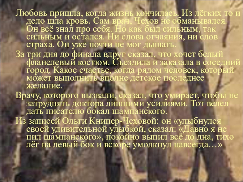Из записей Ольги Книпер-Чеховой: он «улыбнулся своей удивительной улыбкой, сказал: «Давно я не пил шампанского», покойно выпил всё до дна, тихо лёг на левый бок и вскоре умолкнул навсегда…»