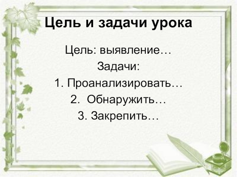 Цель и задачи урокаЦель: выявление…Задачи:1. Проанализировать…2. Обнаружить…3. Закрепить…