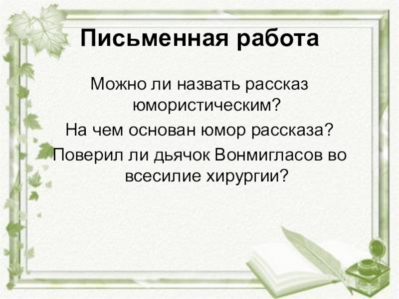 Письменная работаМожно ли назвать рассказ юмористическим? На чем основан юмор рассказа? Поверил ли дьячок Вонмигласов во всесилие