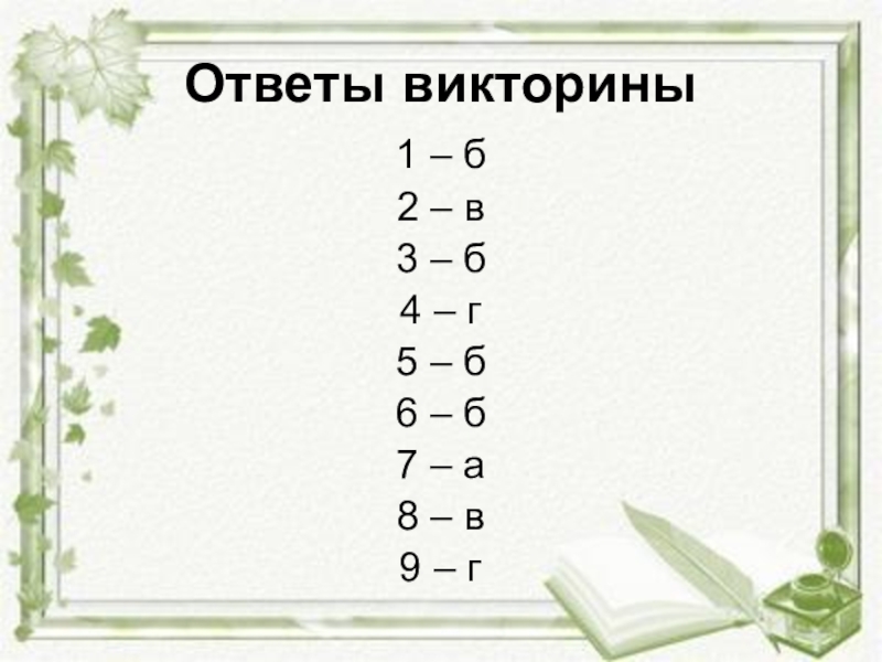Ответы викторины1 – б2 – в3 – б4 – г5 – б6 – б7 – а 8