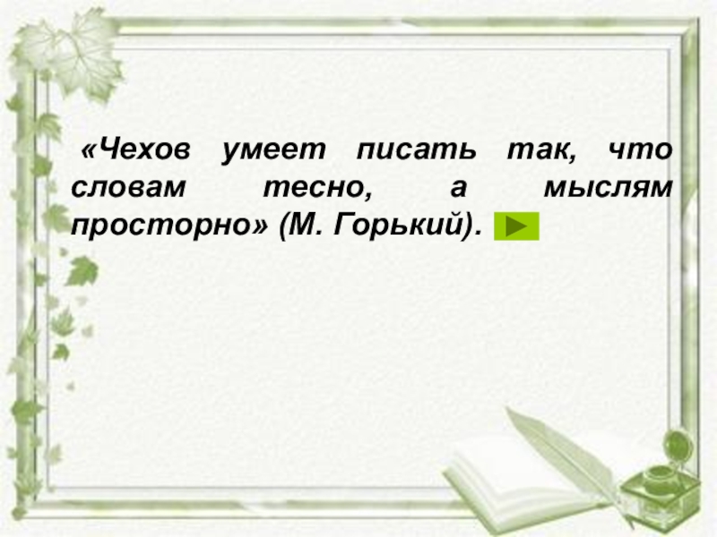 Слайд 10 «Чехов умеет писать так, что словам тесно, а мыслям просторно» (М.