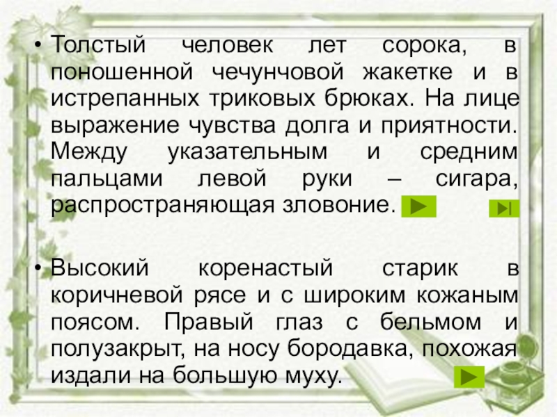 Слайд 11Толстый человек лет сорока, в поношенной чечунчовой жакетке и в истрепанных