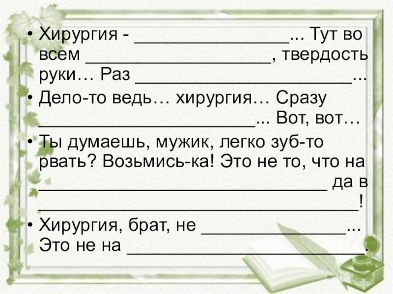 Хирургия - _______________... Тут во всем __________________, твердость руки… Раз _____________________...Дело-то ведь… хирургия… Сразу _____________________... Вот, вот…Ты
