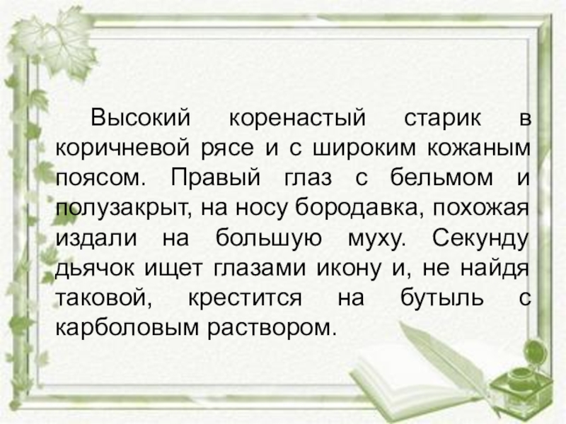 Правый глаз с бельмом и полузакрыт, на носу бородавка, похожая издали на большую муху. Секунду дьячок ищет глазами икону и, не найдя таковой, крестится на бутыль с карболовым раствором.
