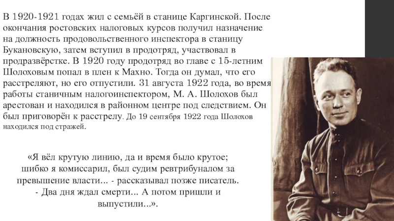 «Я вёл крутую линию, да и время было крутое; шибко я комиссарил, был судим ревтрибуналом за превышение власти... - рассказывал позже писатель. - Два дня ждал смерти... А потом пришли и выпустили...».