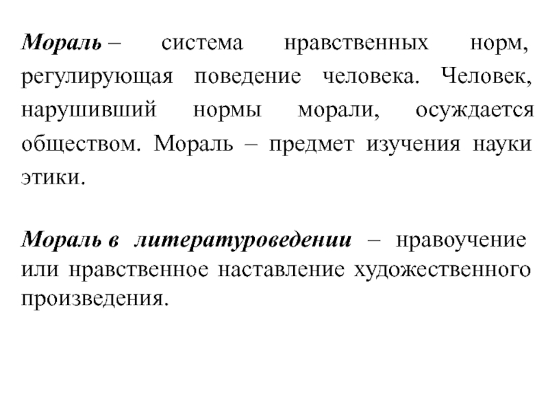 Мораль – система нравственных норм, регулирующая поведение человека. Человек, нарушивший нормы морали, осуждается обществом. Мораль – предмет изучения