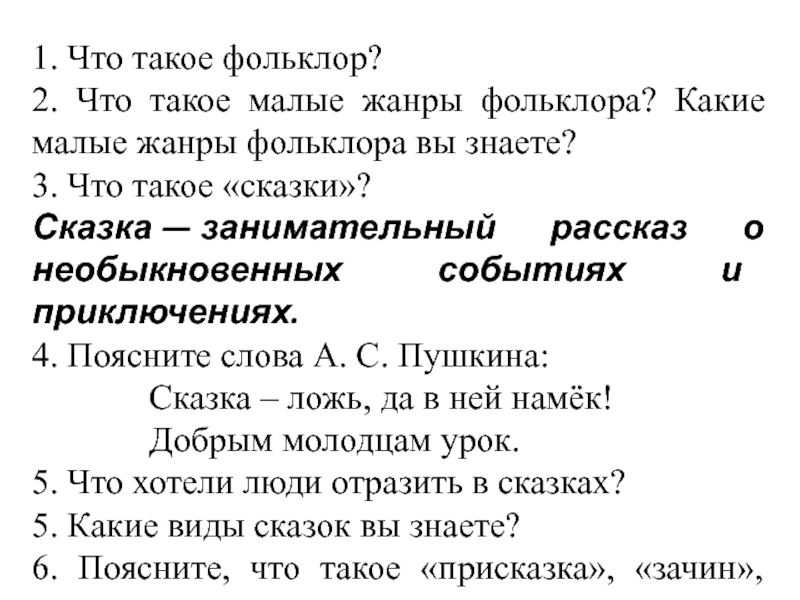 1. Что такое фольклор?2. Что такое малые жанры фольклора? Какие малые жанры фольклора вы знаете?3. Что такое «сказки»?Сказка — занимательный рассказ о необыкновенных событиях и приключениях. 4. Поясните слова А. С. Пушкина:Сказка – ложь, да в ней намёк!Добрым