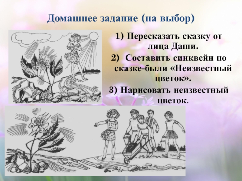 Домашнее задание (на выбор)1) Пересказать сказку от лица Даши.2) Составить синквейн по сказке-были «Неизвестный цветок».3) Нарисовать неизвестный
