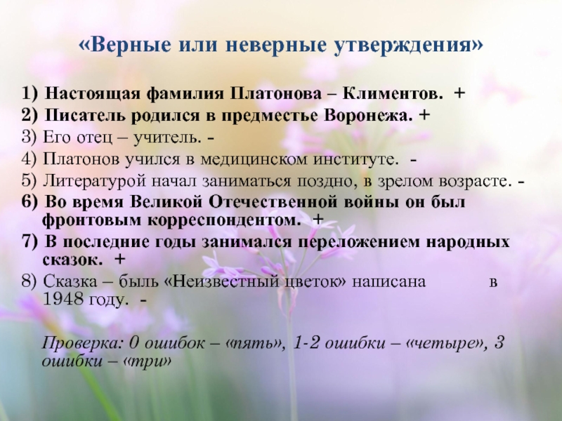 «Верные или неверные утверждения» 1) Настоящая фамилия Платонова – Климентов. +2) Писатель родился в предместье Воронежа. +3)
